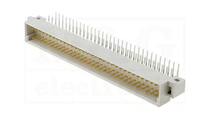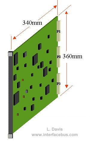 Boards will connect to a backplane using three DIN-41612 96-pin male connectors. The connectors are designated as P1 (top), P2 (middle), and P3 (bottom).